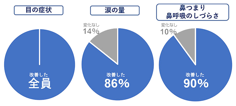 - 「目の症状」「涙の量」「鼻づまり・鼻呼吸のしづらさ」については被験者の約9割が改善し、その他の自覚症状については全般的にすべての患者で改善の傾向が見られた。